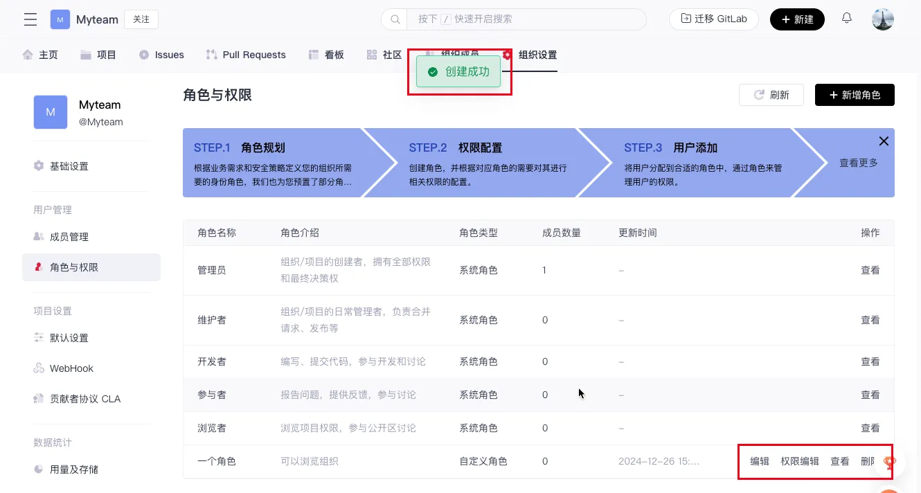 组织管理员可以根据组织的实际需求创建自定义的用户角色,并灵活地定义角色名称和权限。