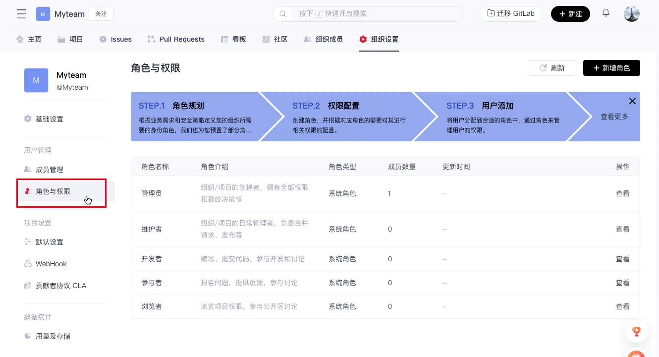 - 点击成员管理下方的「角色与权限」可进入角色与权限管理页。