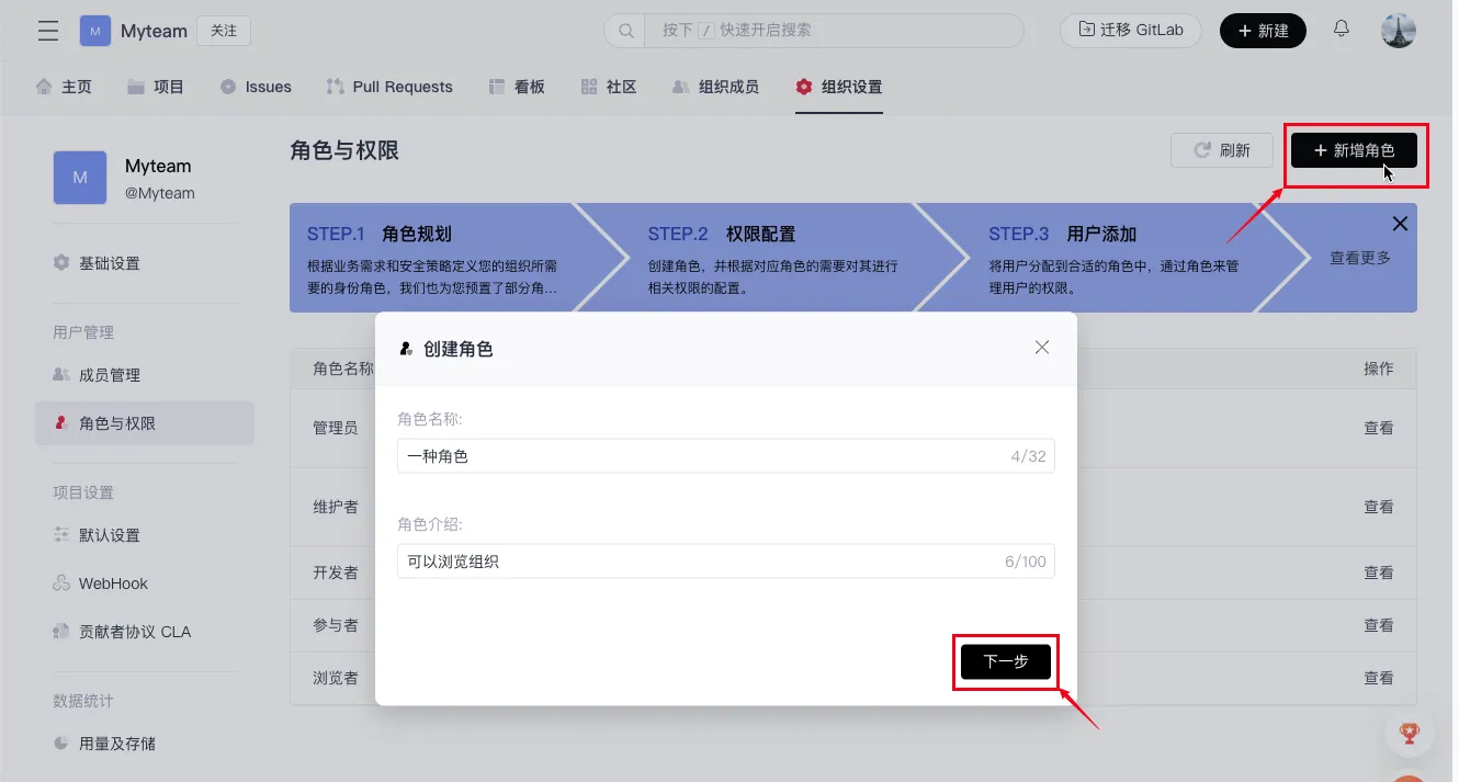 - 点击右上角「新增角色」后输入角色名称和角色介绍后点击「下一步」。