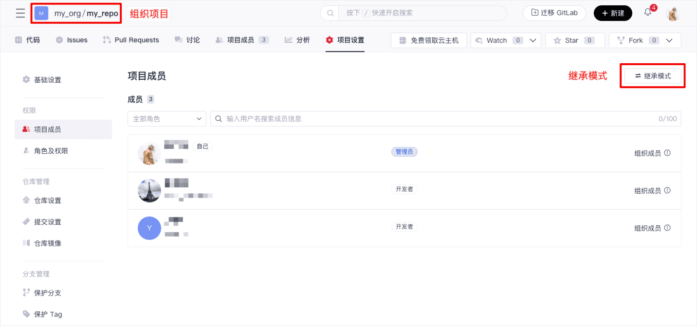 - 继承模式:组织项目的所有成员将继承自组织,继承模式下不允许单独添加非组织成员。
