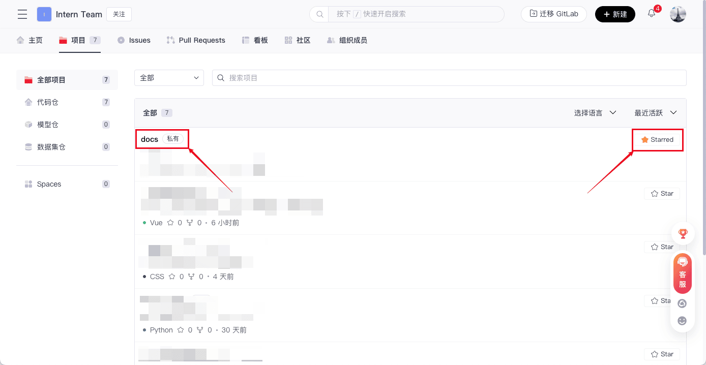 - 点击左侧分类栏分类,可以查看不同类型的仓库/项目。