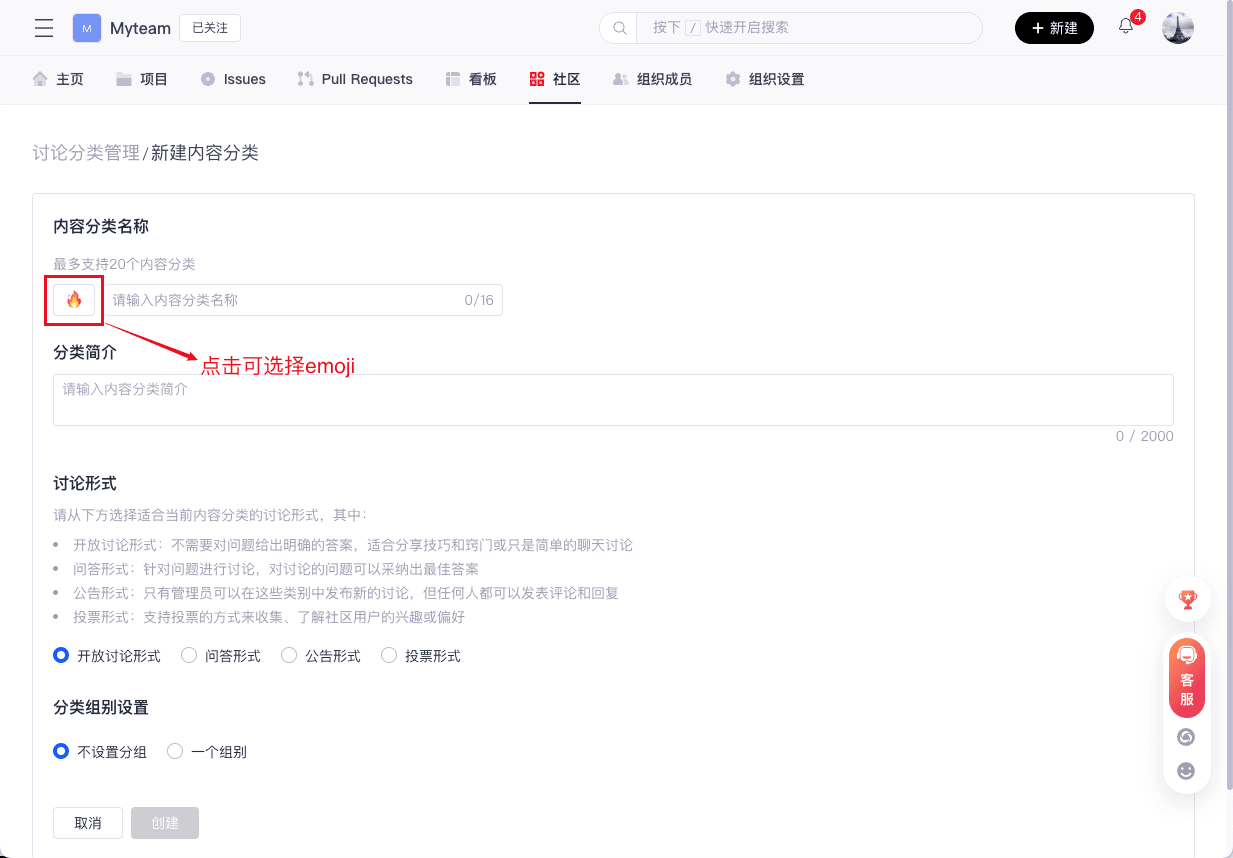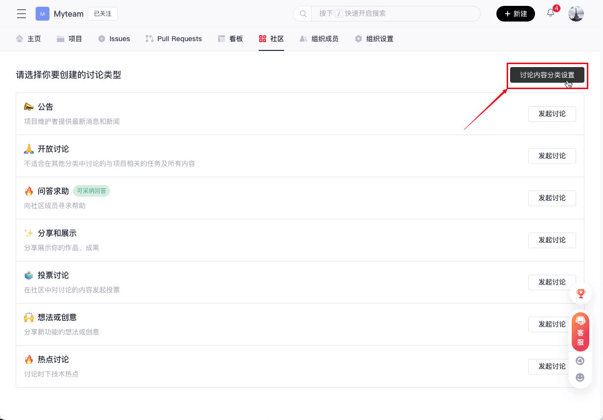 - If you are an administrator of this organization, click on 「Discussion Content Category Settings」 at the top right corner to set the categories of discussion content in the project: