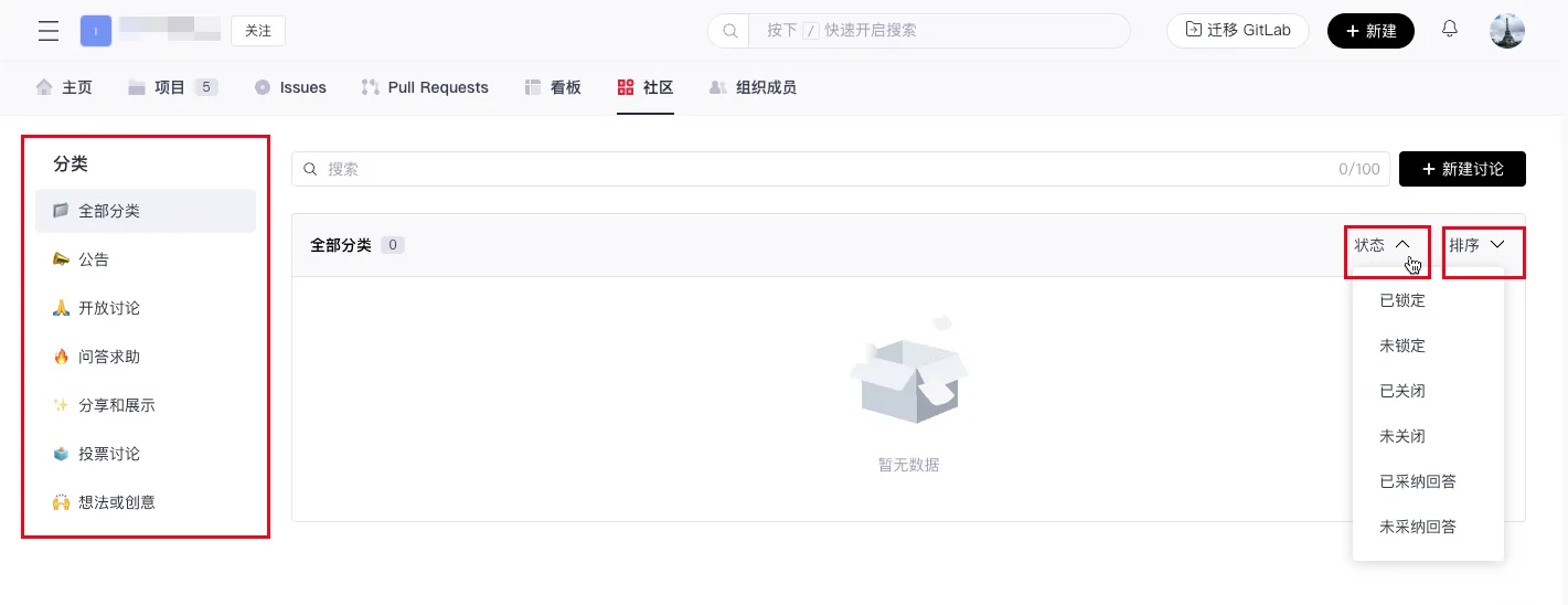 - The left-side category bar allows you to view different types of discussions; the dropdown box on the right side of the category list can sort discussions by status and order.