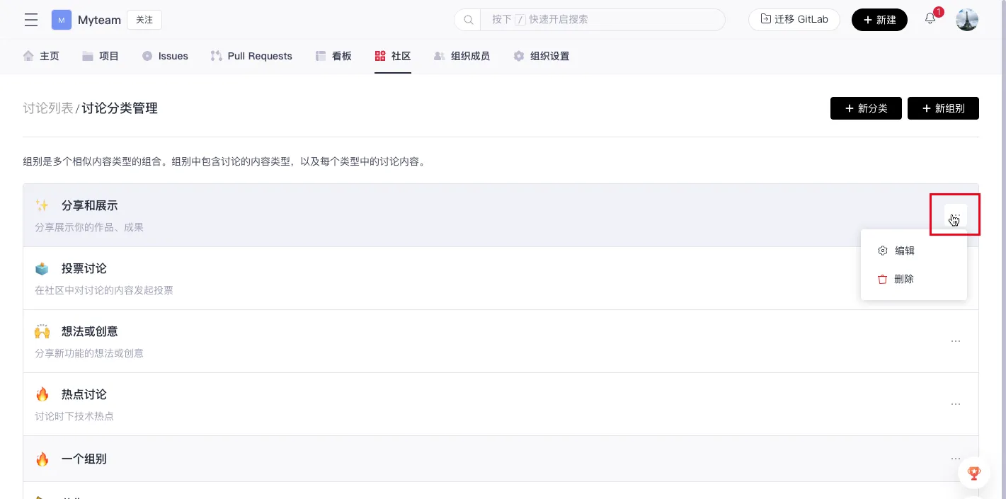- Click on 「New Category」/「New Group」 to create a new discussion category or group within the organization.