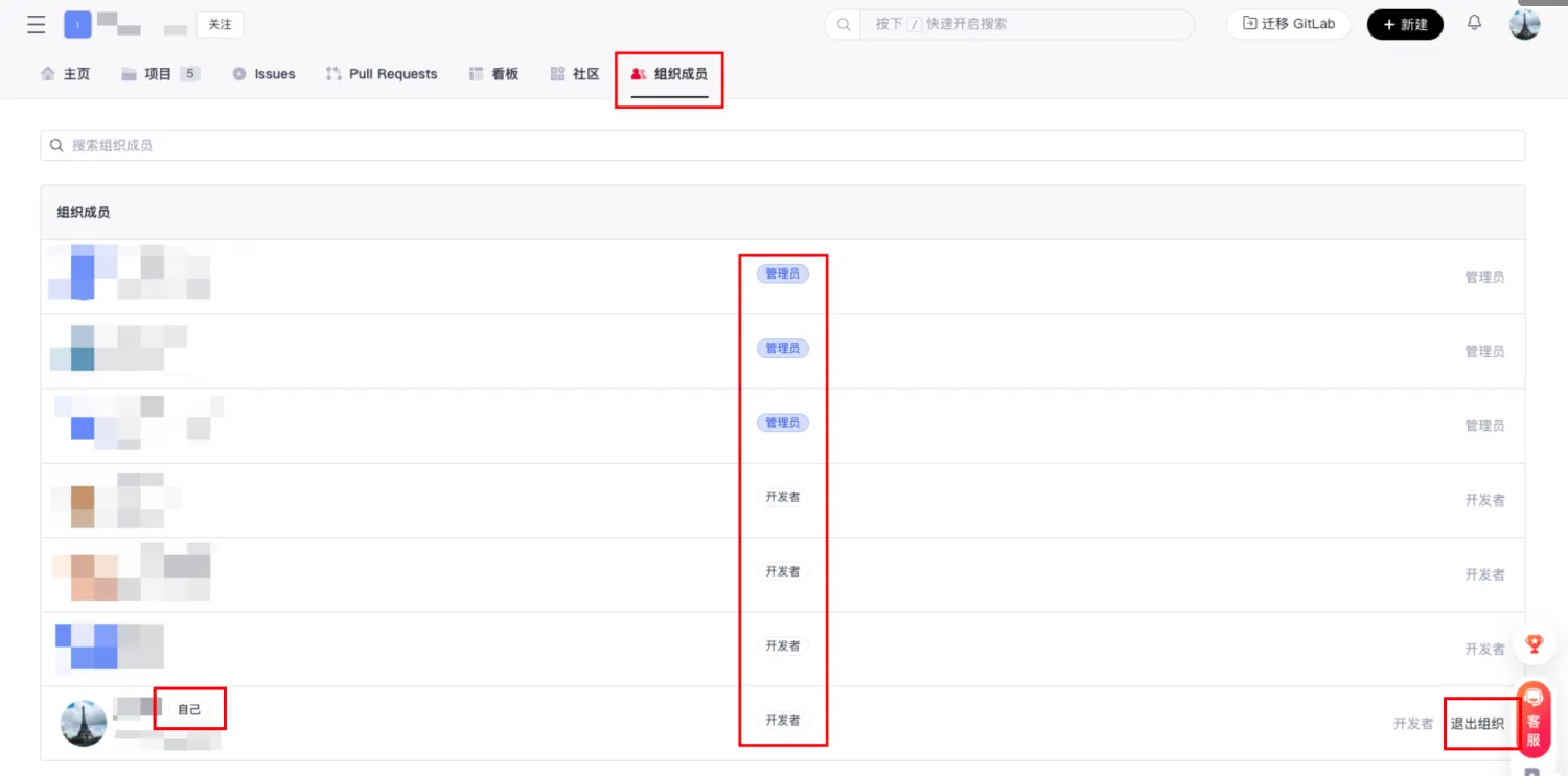 - Click the dropdown at the top to filter organization members by role; click to open the search box and enter a username or member information to find corresponding members.