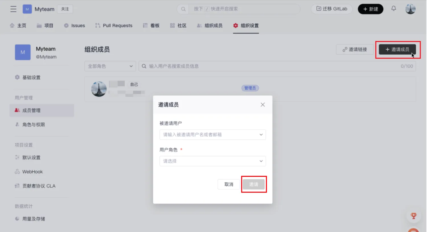 - Click 「Invite Members」 at the top right, enter the username and email of the person you want to invite, select their role, and then click 「Invite」 to send the invitation.
