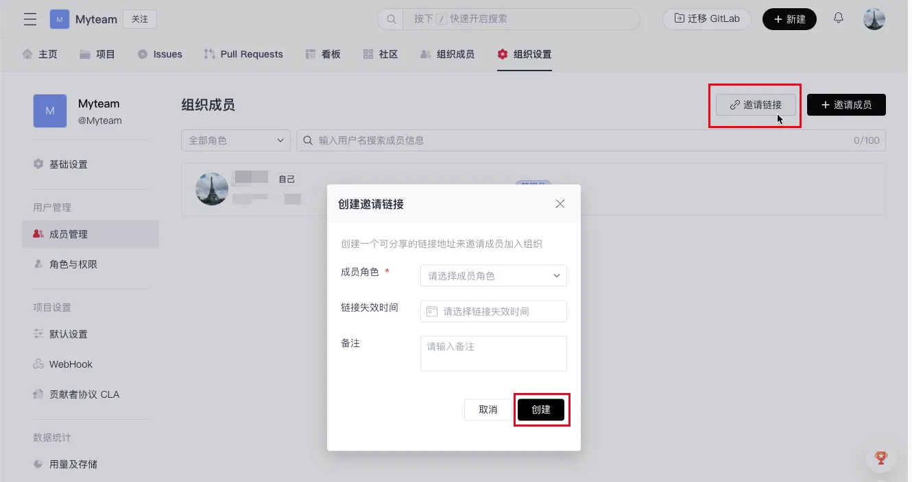 - Click 「Invite Link」 at the top right, select the member's role, the expiration time of the invitation link, and enter a note.