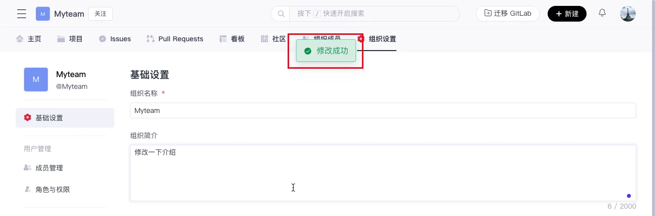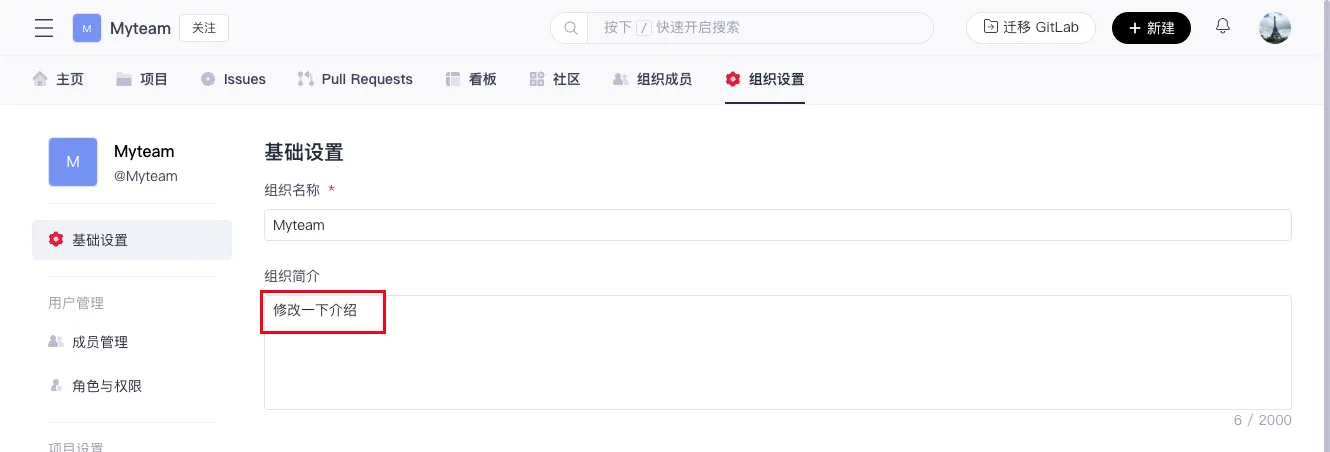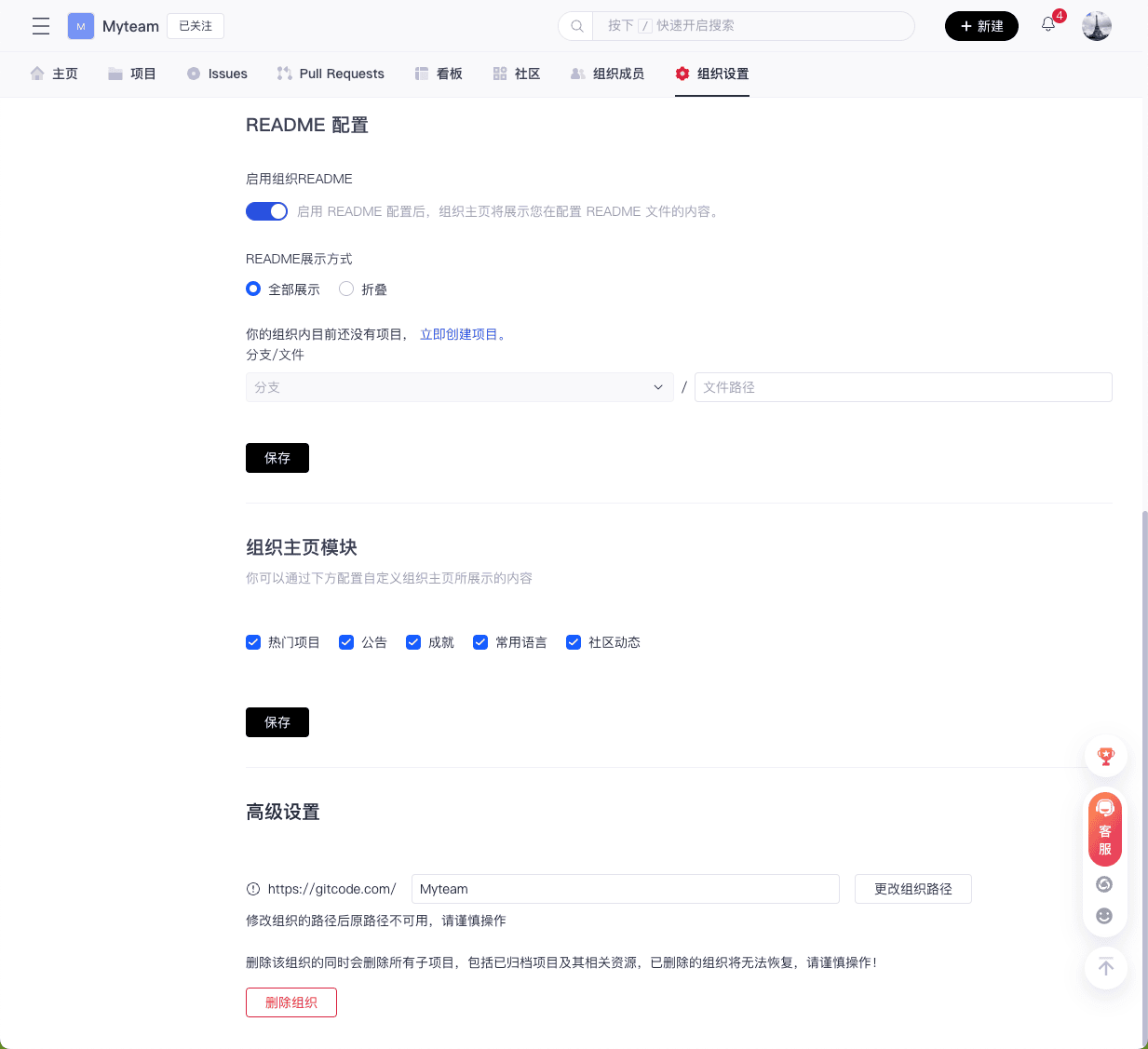 - The basic settings module displays the organization name and description. If you need to make changes, you can directly modify them in the input box. After completing the modification, click "Save" below the README module to successfully apply the changes.