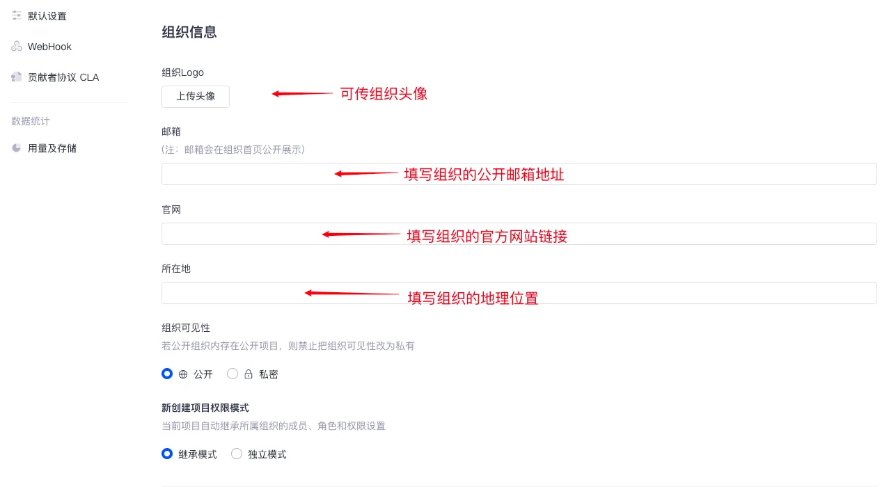 Organization information includes basic details such as the logo, email, website, and location, and supports setting visibility to public or private. New projects can choose to inherit organization members and permissions or manage independently to meet different permission requirements.