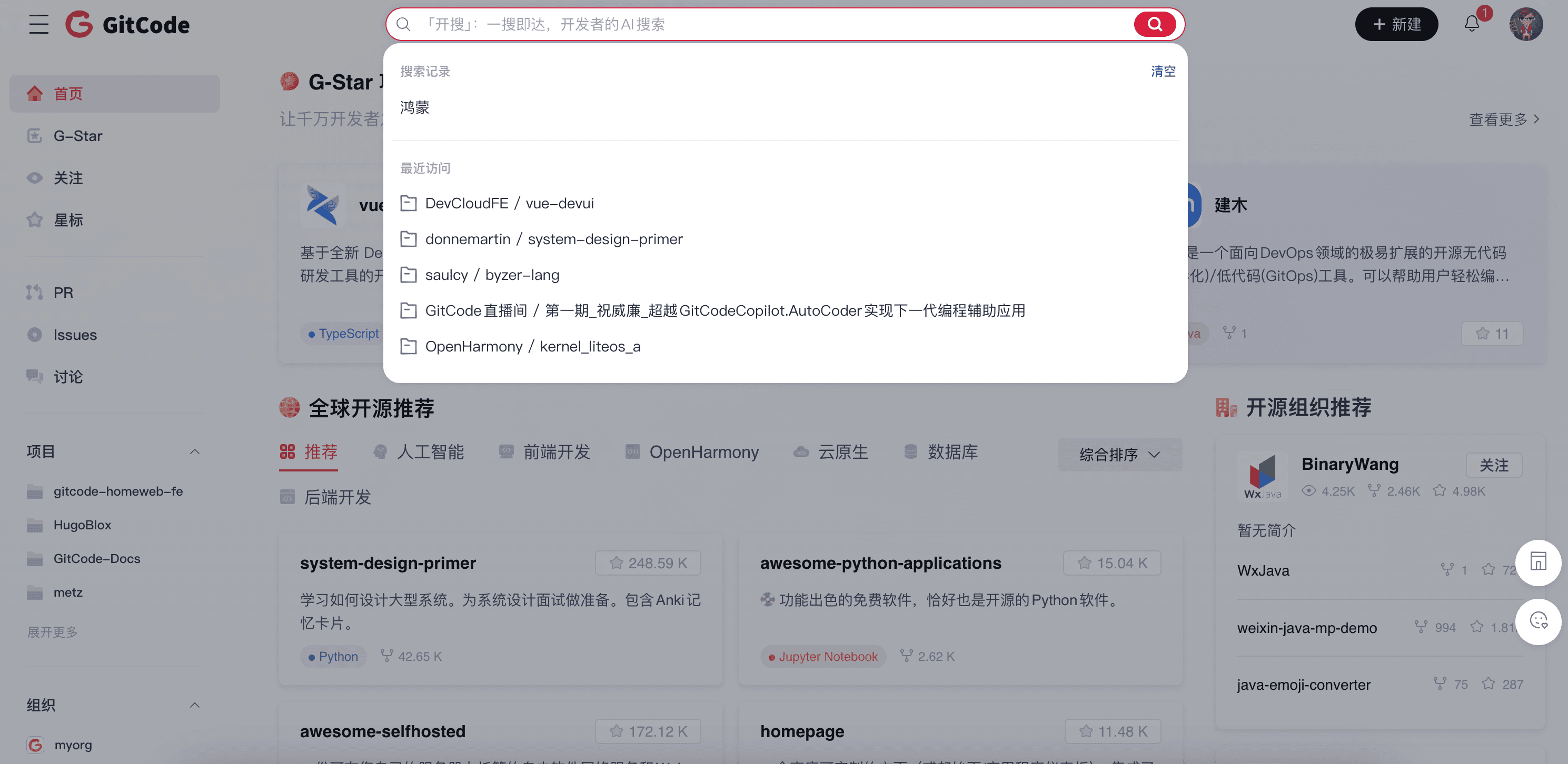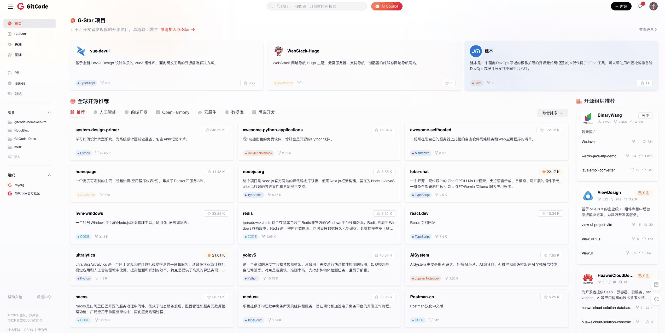- Global Open Source Recommendations: Including trending projects and six major categories of open-source projects on GitCode.
