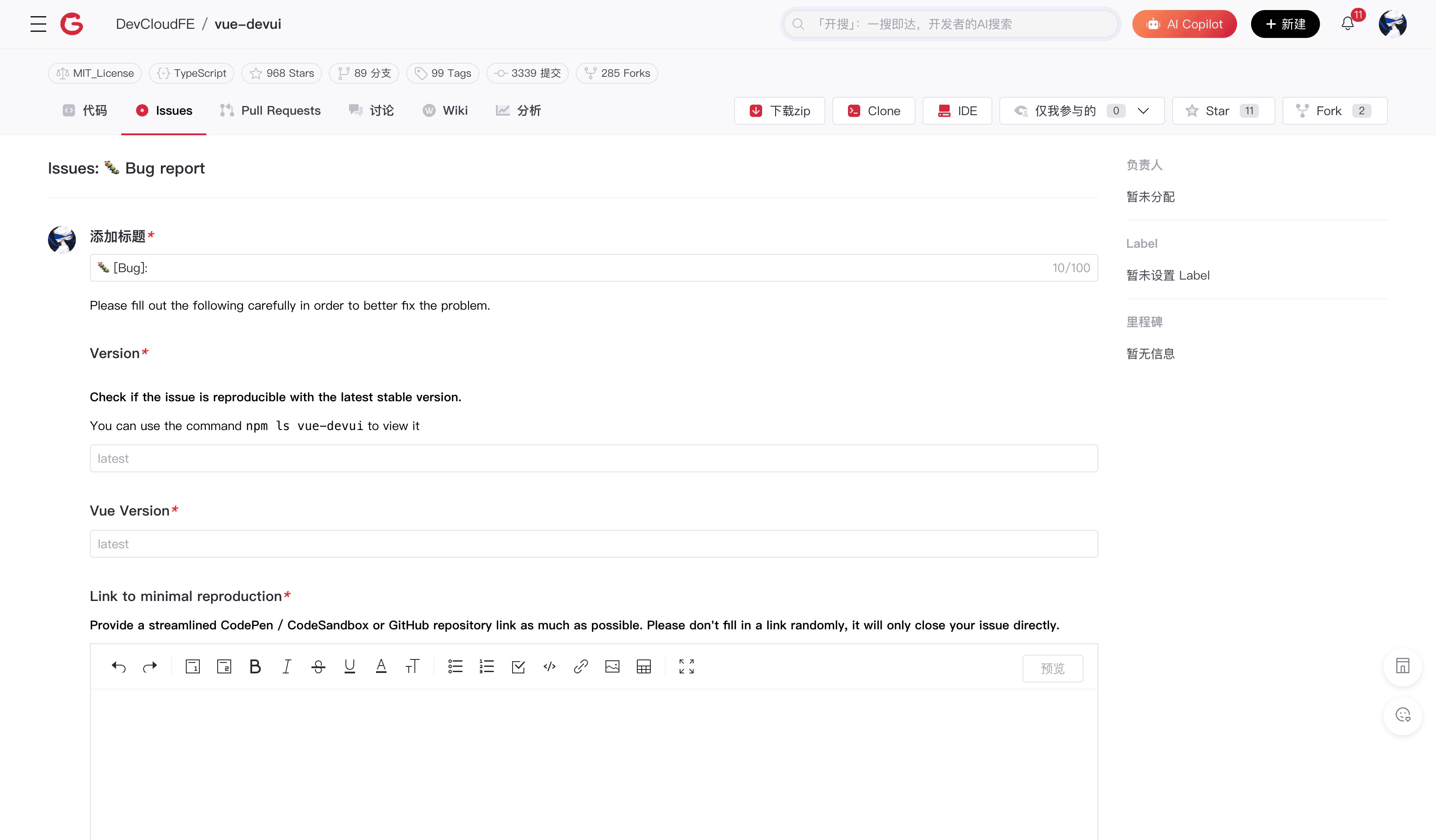 Customize Issue templates to create standardized problems or feature requests with one click, making your development work more organized.