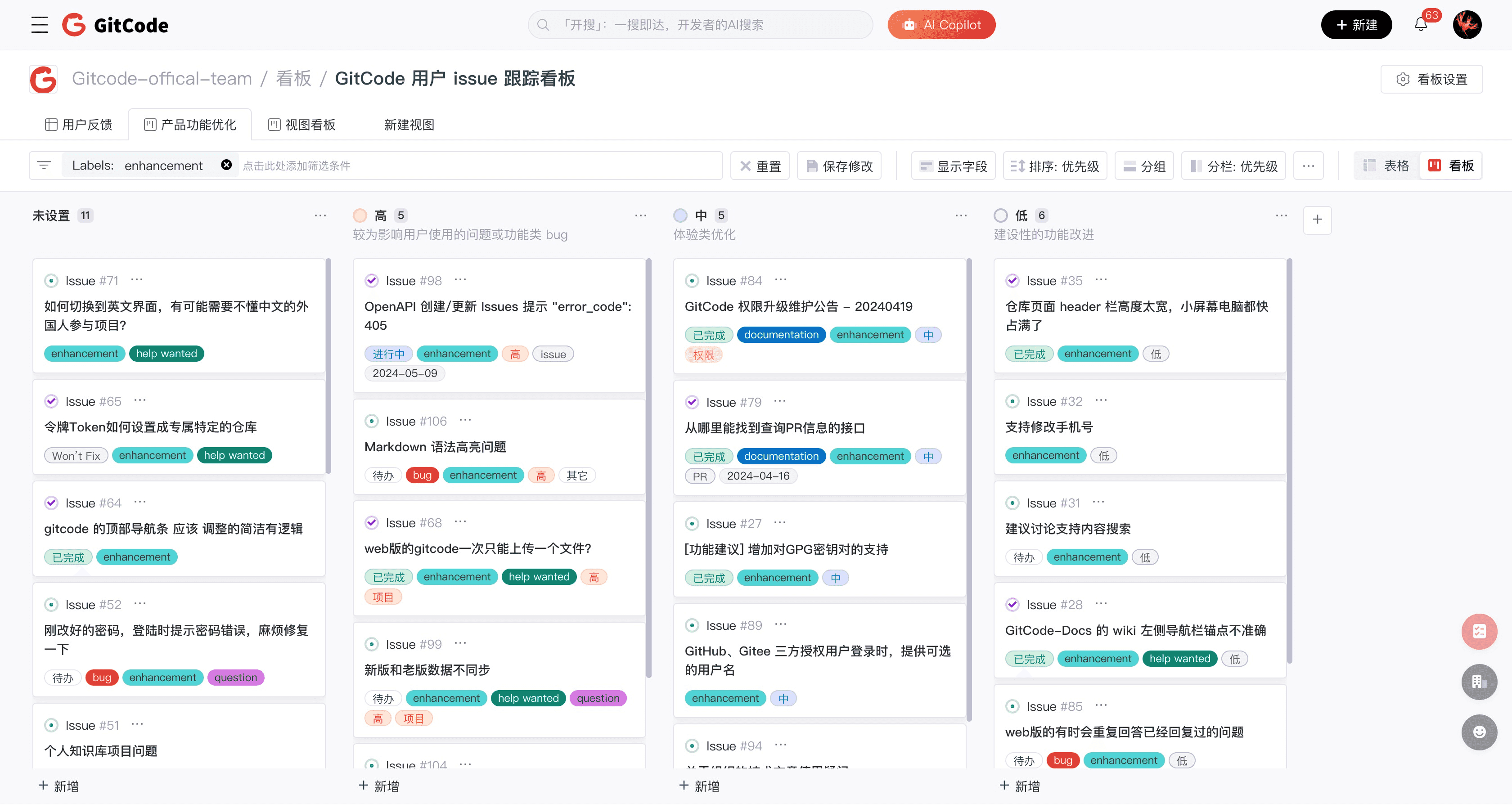 The GitCode board function has been enhanced, adding a board view on top of the existing table view, providing users with a more flexible and efficient project management tool, enhancing team collaboration efficiency.